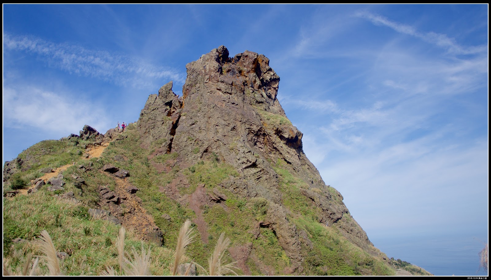 由於距離稍遠,相對起來【基隆山】嬌小了一點,前方山脈較為低矮,批滿著芒草,剛好襯托起【基隆山】,而且【燦光寮山】高度比【基隆山】高了不少,可以看到遠方海灣景色和海上的【基隆嶼】。