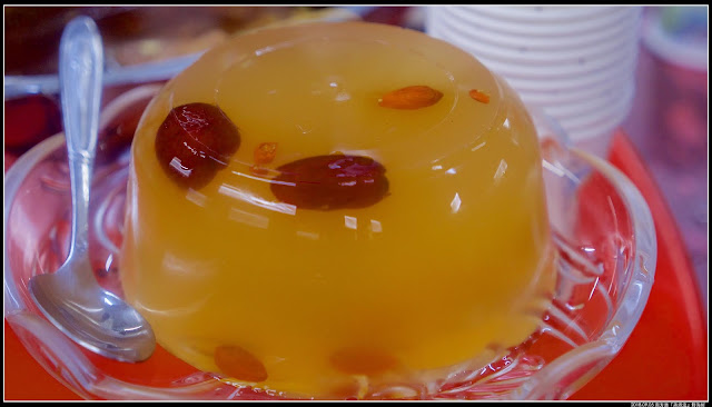 這是最後的壓軸,河豚果凍,用河豚皮熬出的魚凍,搭配紅棗,做成甜品,很好吃,一點腥味都沒有!