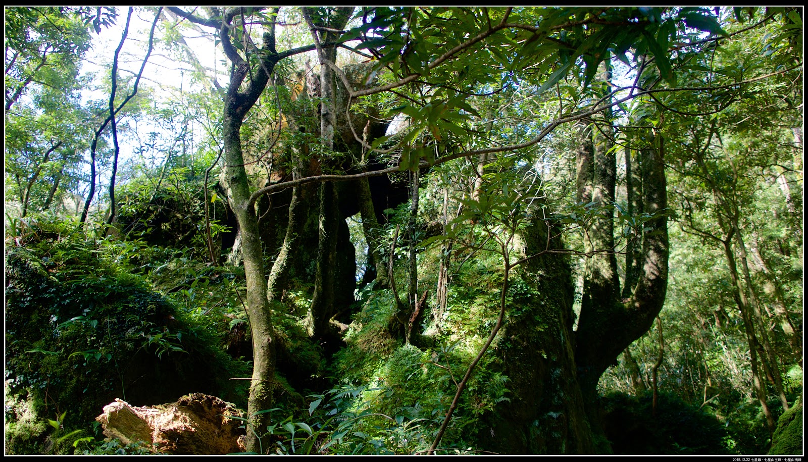 這張照片是走上【七星山主峰】觀景岩,往回看剛剛鑽過的箭竹林,從山神廟爬上來,就是從岩石下這片箭竹鑽出來。