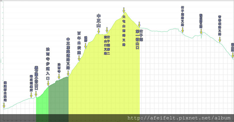 〖中正山步道〗-【中正山】-竹子湖,每段路線的高度距離,大致是: