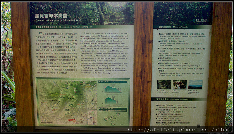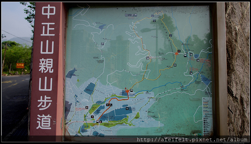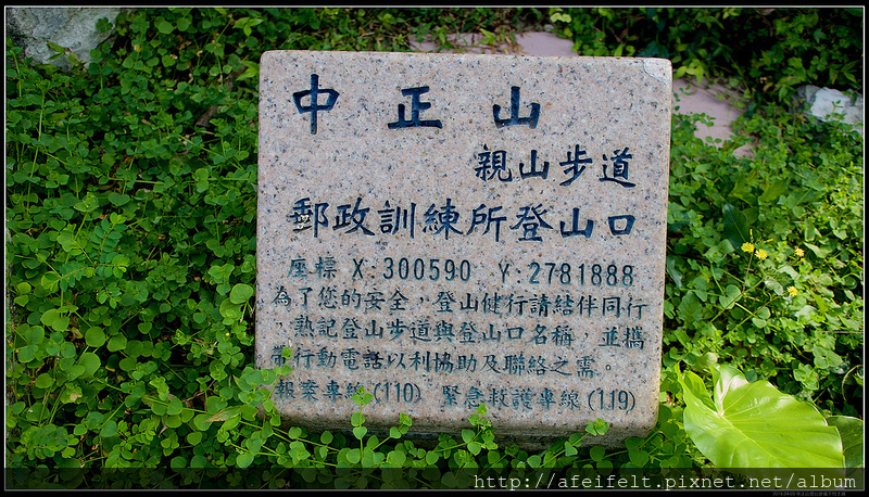 A、北投義方國小旁邊登山口,經由〖郵政訓練所步道〗、〖法雨寺步道〗(這兩條短步道其實都是〖中正山步道〗的一小段)、〖中正山步道〗到達【中正山】基點。
