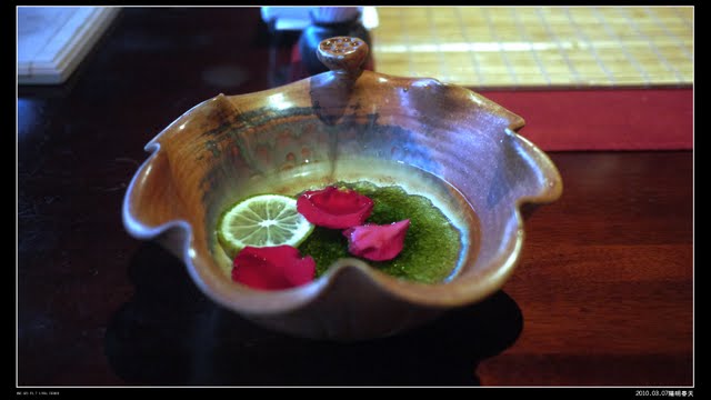 這是讓我們洗手的水瓢,玫瑰花瓣,檸檬片.........