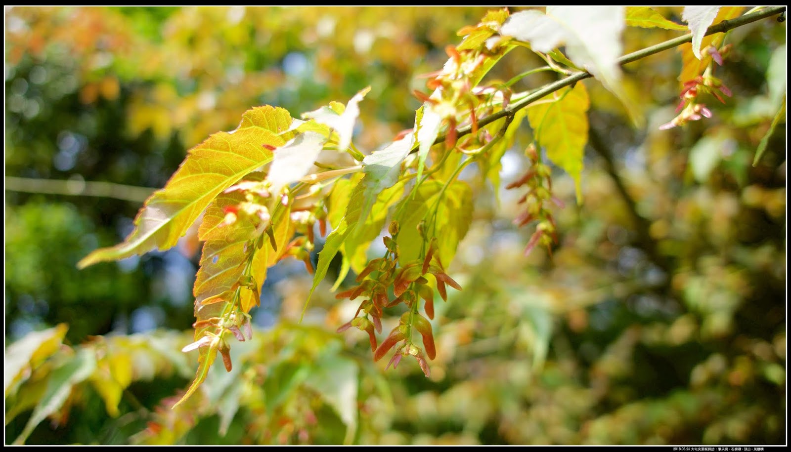 這棵是冷水坑生態池旁邊的「大屯尖葉槭」 ,兩週前來,還在盛開著,尚未結成翅果,這次來看,已經垂掛著滿滿紅撲撲翅果(翅果成熟後會變成青綠色)