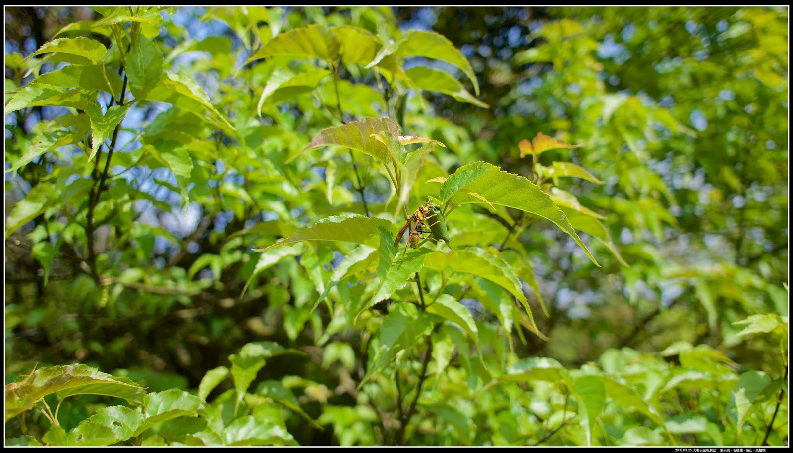 這裡也躲著一隻,不知道是不是蜂?很聰明還會找顏色相似的葉子來躲。
