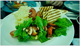 擺盤用巧克力醬勾畫出的圖案,有畫龍點睛之妙,不過,這在許多咖啡廳都可以看到類似巧思,似乎就不是那樣的特別,個人很喜歡那薄荷葉,除了在顏色上,鮮綠色調和了巧克力烏黑原色,並加上鮮嫩生命活力,在味道上,個人嚐試將這三種風味一起咀嚼:薄荷葉微辛香氣和甘味巧克力粉、微甜榛果,三種口味在口中翻滾著,頗為特別。