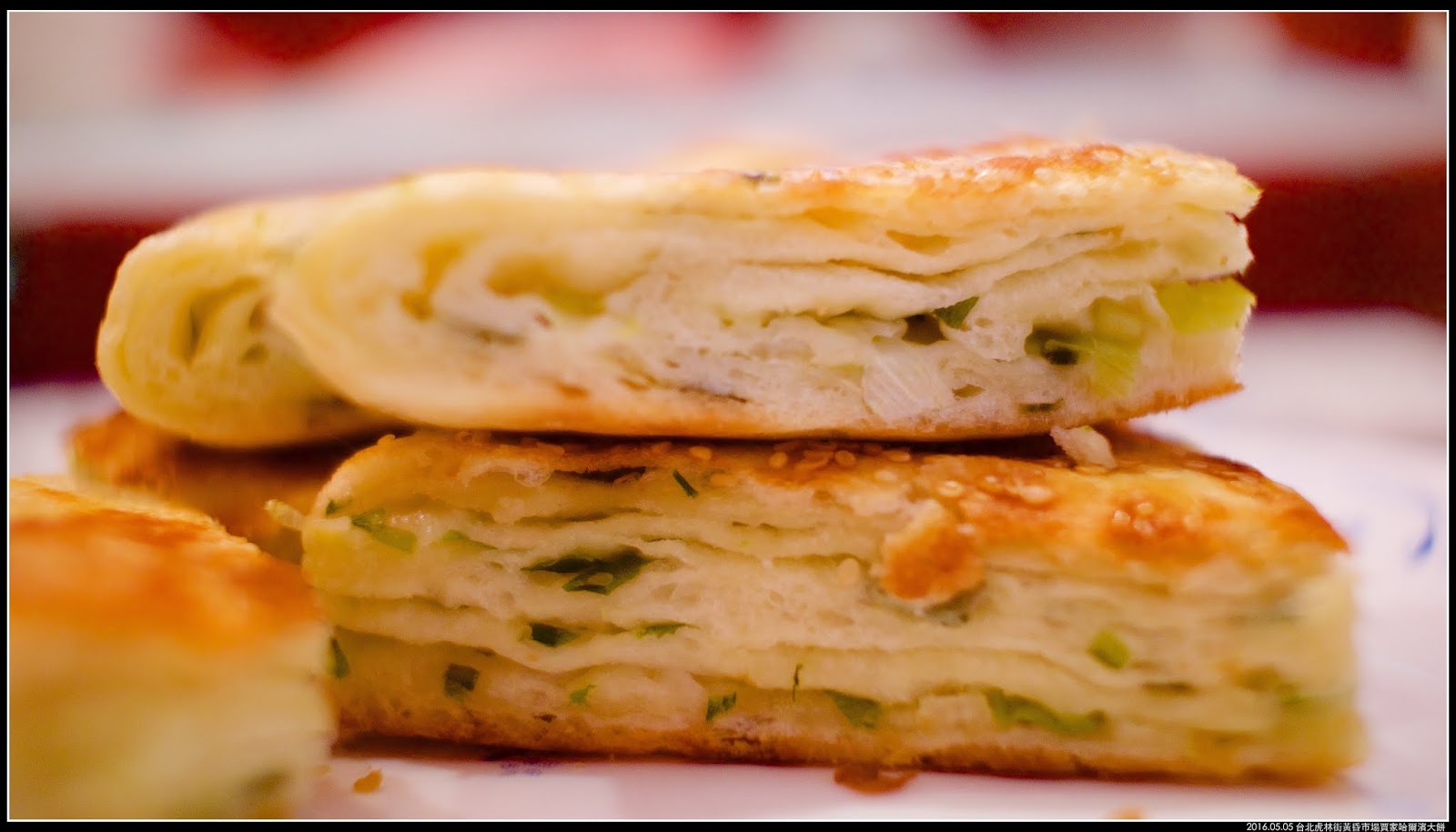 側面看千層蔥花大餅,可以看到千層的模樣,每一層之間都有著蔥花。