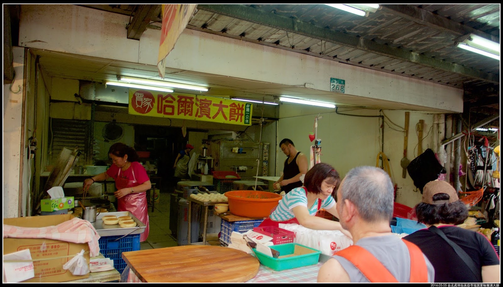 〖賈家哈爾濱大餅〗店面在虎林街黃昏市場來說,已經算是大店面了,裡面還是擺著滿滿考具。
