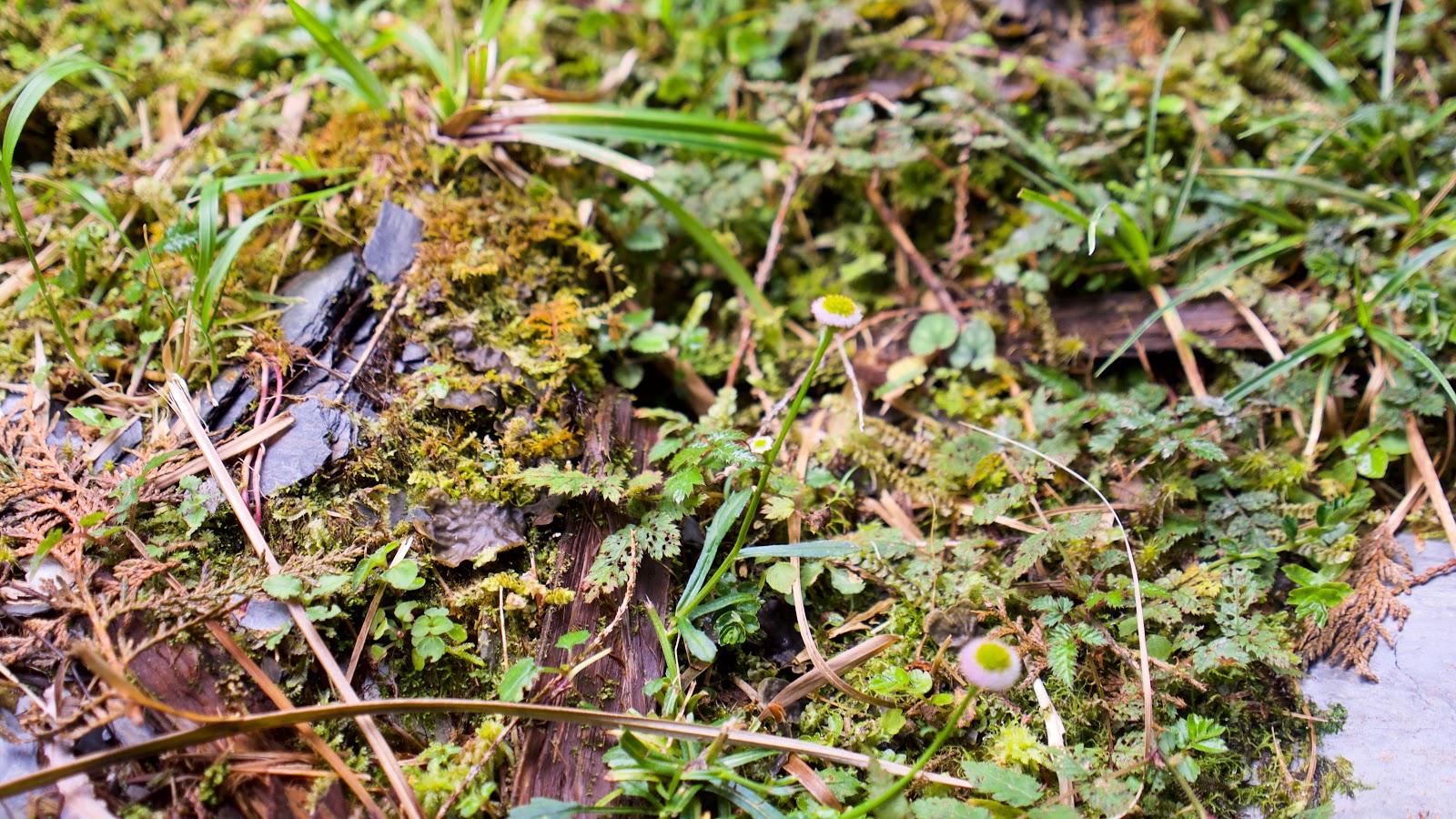 柳杉枯木斷面裡面生意盎然,除了瓦葦、地衣之外,這小個子也努力開出豔麗自色的四瓣小花朵。 對照身後的瓦葦葉子,就知道這小草個子有多嬌小。