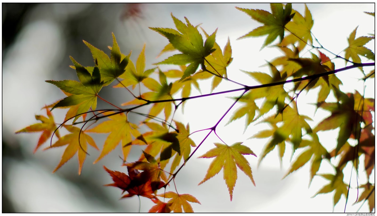 有時候一些光跡凸顯了楓葉上斑駁、不純淨的角落,這樣有缺陷的呈現算是一種對比用途的選擇。