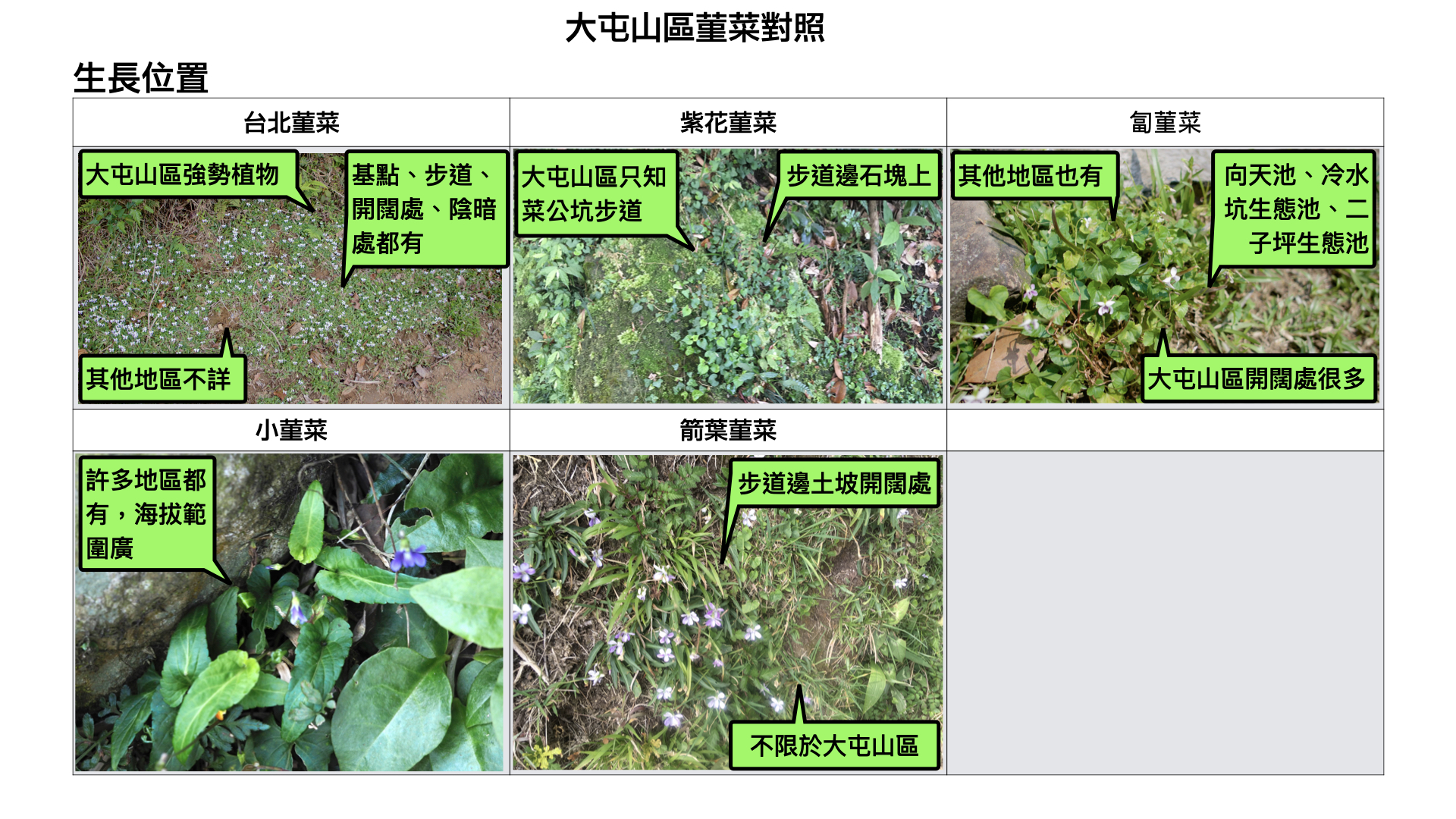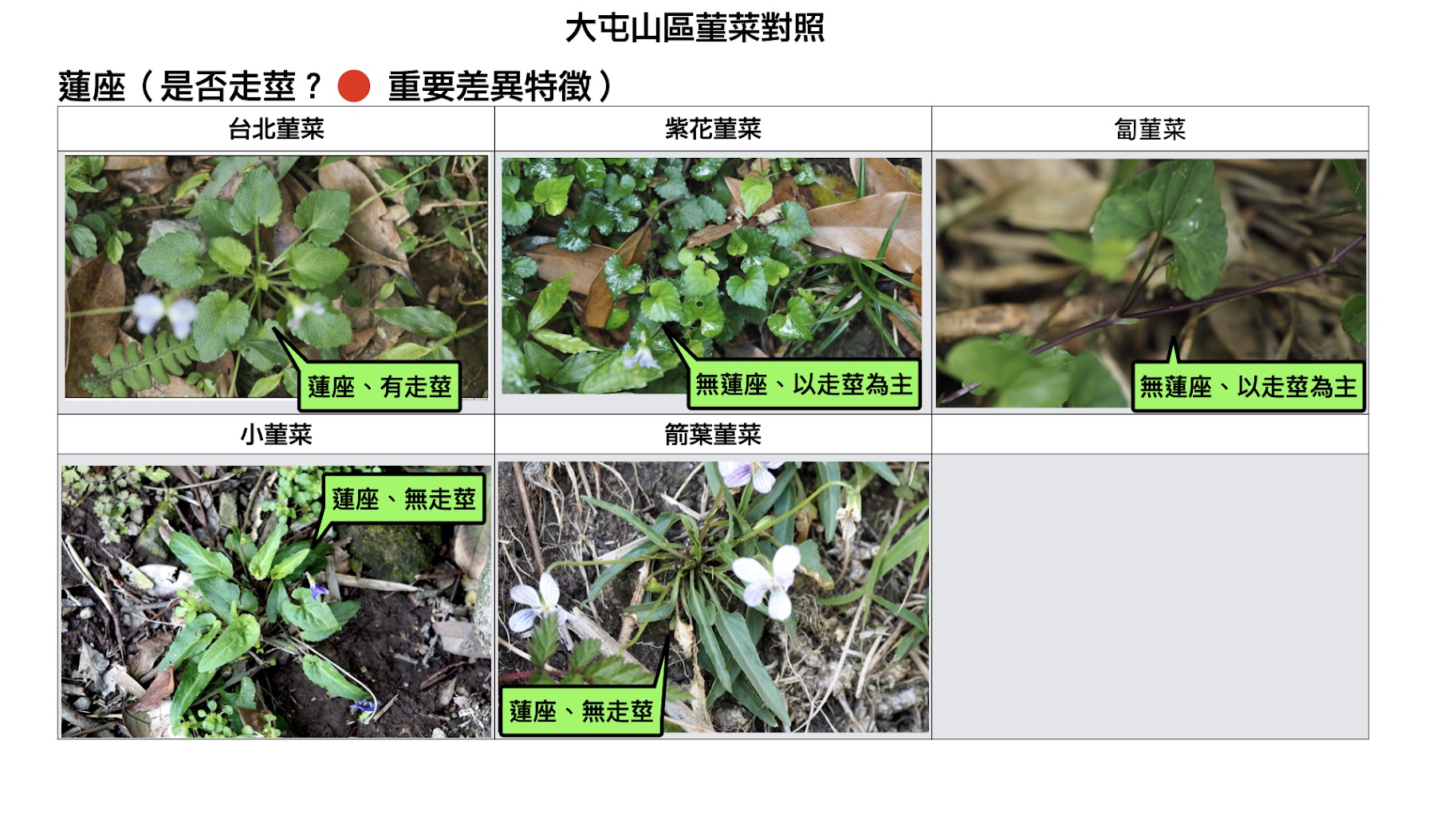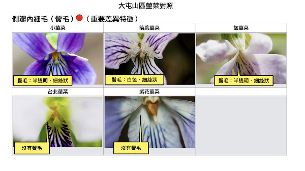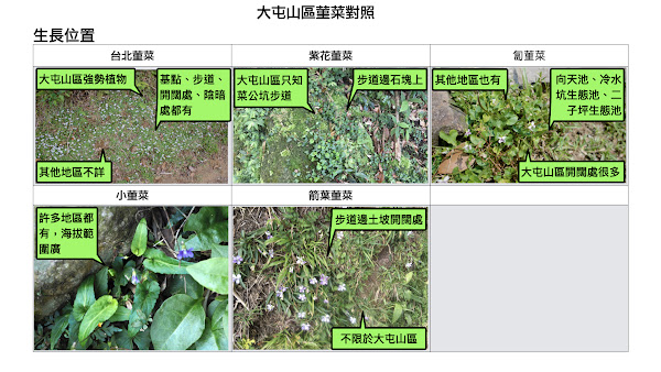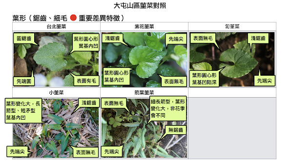【網誌】:〖菫菜彙整〗大屯山區堇菜比較圖表:台北堇菜、匐堇菜、紫花堇菜、小堇菜、箭葉堇菜。