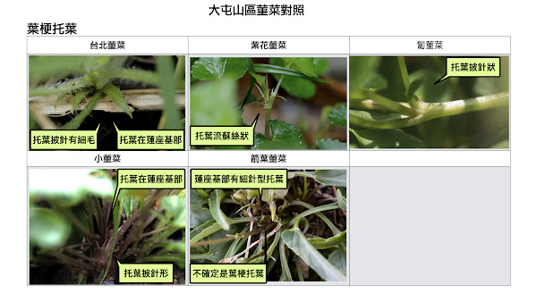 大屯山區這五種堇菜的花梗托葉都是「細披針形」,所以難以用花梗托葉來分辨。