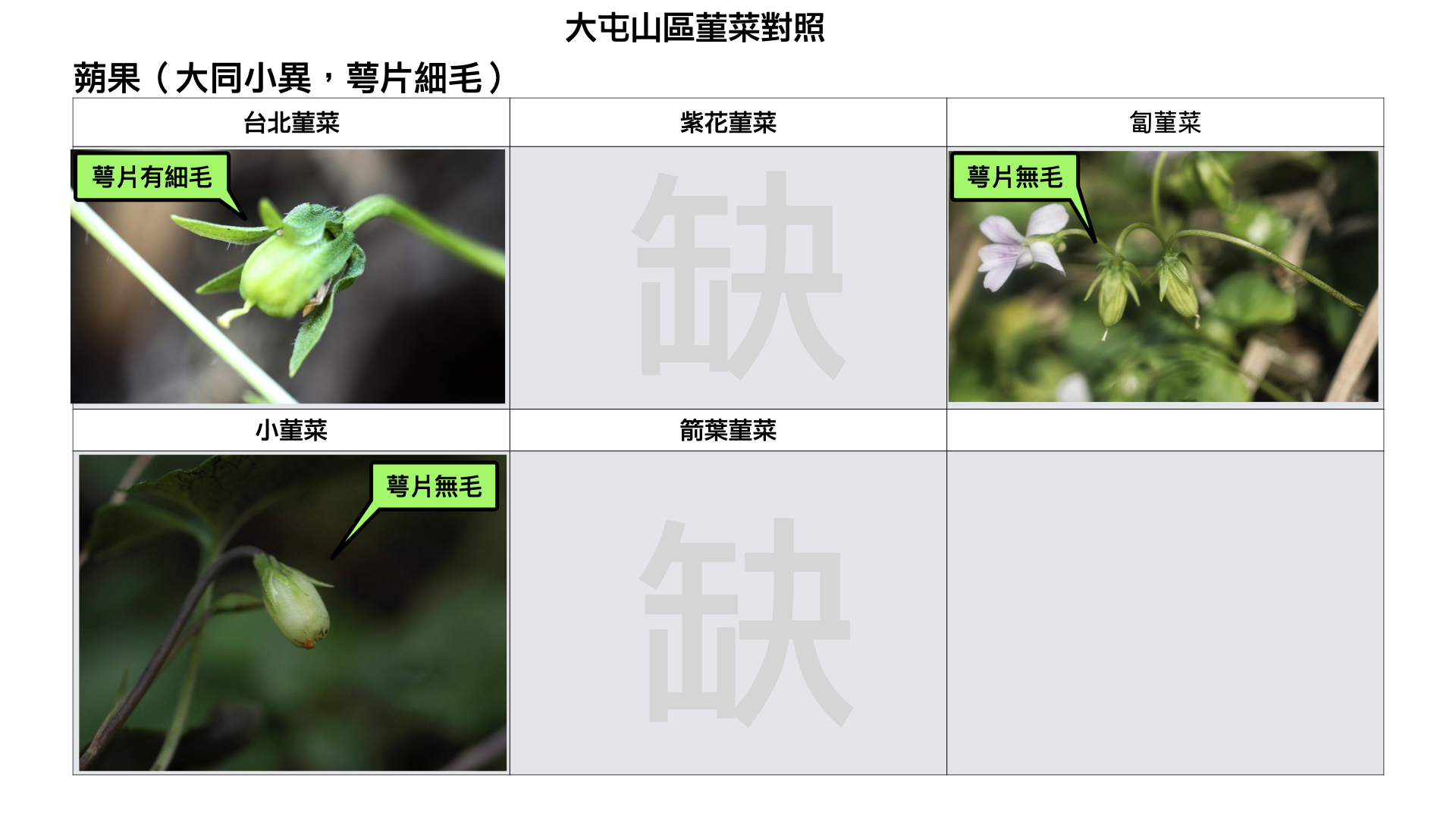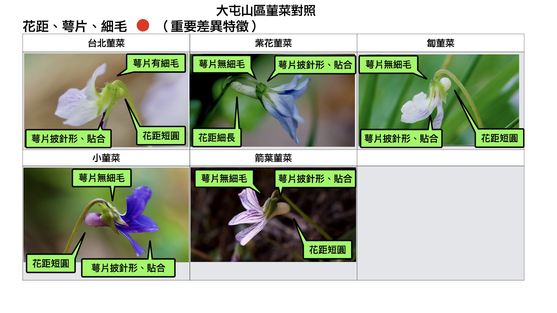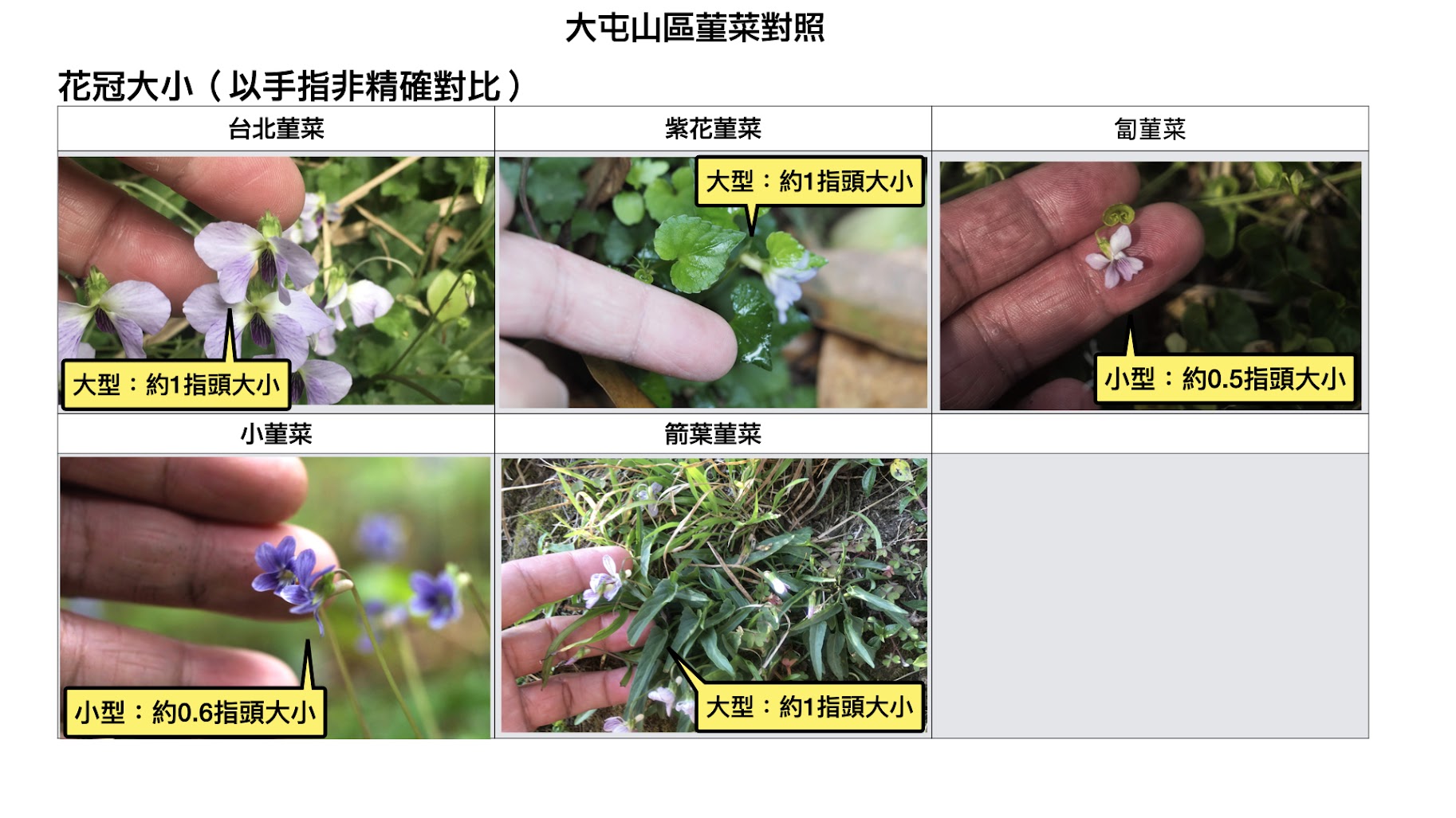 以上就可以將大屯山區這五種堇菜區分出三種堇菜,剩下「小堇菜、箭葉堇菜」需要進一步分辨。 -